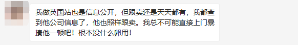 随后也有卖家进行了附和:我做英国站也是信息公开,但跟卖还是天天都有,我都查到他公司信息了,他也照样跟卖。我总不可能直接上门暴揍他一顿吧!根本没什么卵用!