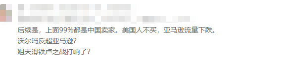 更有卖家吐槽姐夫此举是搬起石头砸自己的脚:后续是,上面99%都是中国卖家。美国人不买,亚马逊流量下跌。沃尔玛反超亚马逊?姐夫滑铁卢之战打响了?