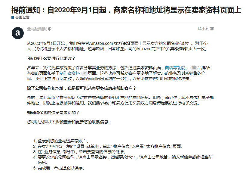 7月8日,亚马逊美国发布了一则“提前通知:自2020年9月1日开始,商家名称和地址将显示在卖家资料页面上”的公告。