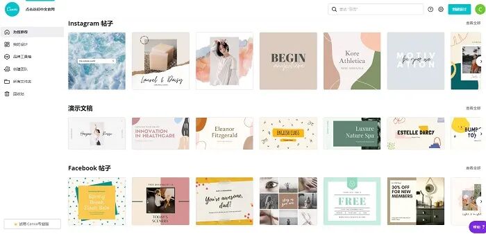 页面排版往往也是内容呈现效果中的重要的一环,这款工具自带丰富的模板资源库,根据不同社媒平台的版面特色,推荐不同风格,用户可以利用预设大小的模板来创建具有专业外观的社交媒体形象。可设计内容类型丰富,包括且不限于外贸人经常使用的:Facebook帖子、邀请函、名片、YouTube缩略图等等。另外,它有简单的拖放功能,且有海量设计素材,对非设计专业人士非常友好,而专业设计人士或许也可以在其中找到新的灵感。目前这款工具可免费试用,还在为内容营销视觉形象设计而发愁的外贸小伙伴可以试试。