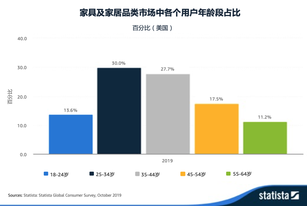 消费人群可以从自有房屋和租房两个角度来看,相较而言,租房客群的客单价偏低,对产品便携性和多功能性的需求更高,更偏爱外观个性及时尚的选品。美国站家具及家居行业中,大部分消费者年龄段在25-44岁,占比57.7%。其中,25-34岁这个年龄段的消费者占比30%,他们也是租房比例较高的一群人[1]。