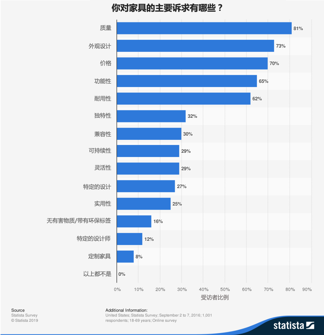 同时,海外消费者对家具及家居品类的主要诉求前五名依次为质量、外观设计、价格、功能性、耐用性,同比其他类目,对物流速度的要求不严苛[5]。