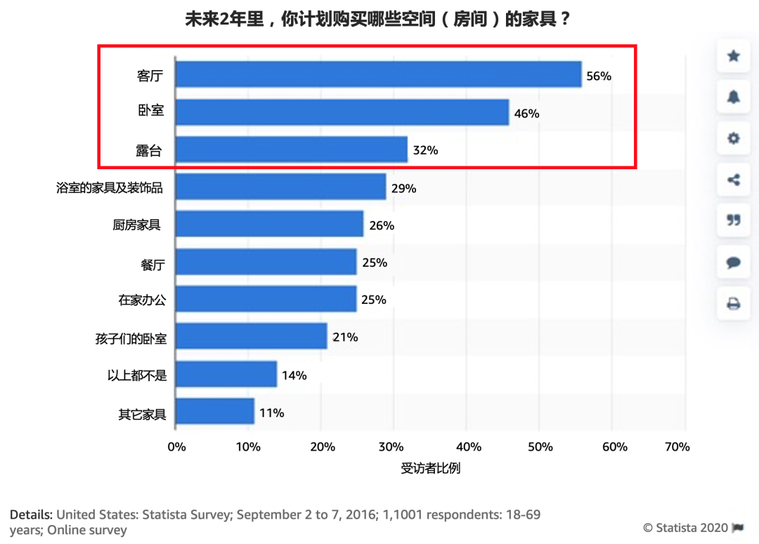 同时,数据显示,客厅、卧室和露台是消费者计划在家中添置新家具排名前三的场景[3]。