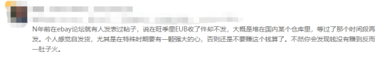 N年前在ebay论坛就有人发表过帖子,说在旺季里EUB收了件却不发,大概是堆在国内某个仓库里,等过了那个时间段再发。个人感觉自发货,尤其是在特殊时期要有一颗强大的心,否则还是不要赚这个钱算了。不然你会发现钱没有赚到反而一肚子火。