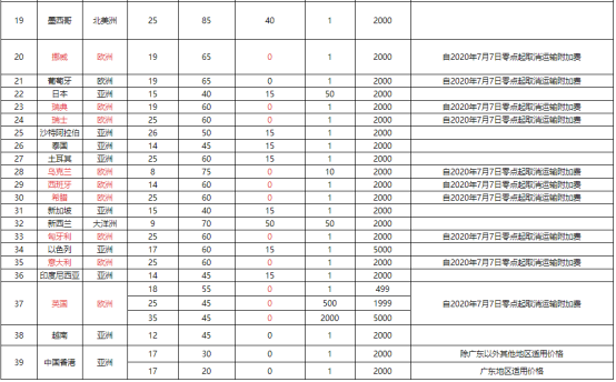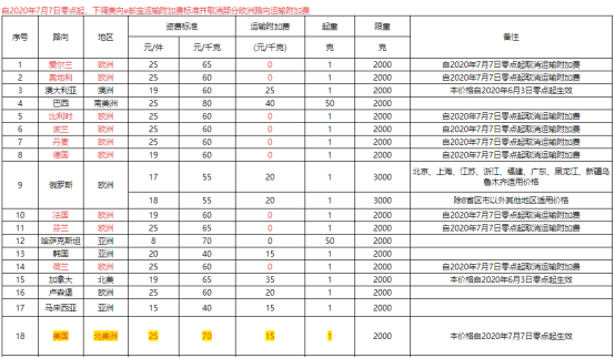 7月6日,中国邮政宣布:自2020年7月7日零点起,下调美向e邮宝运输附加费标准并取消部分欧洲路向运输附加费。