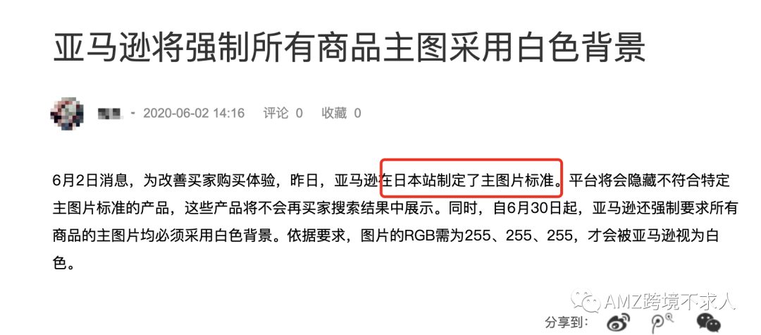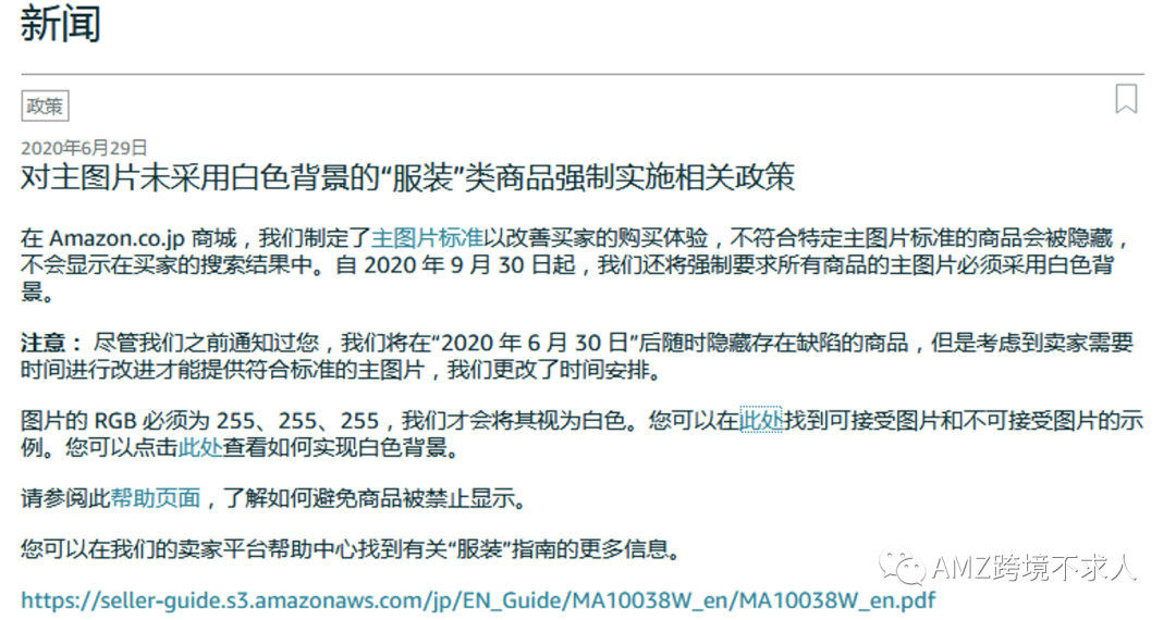 多位博主都发出了这样内容:“近日,亚马逊日本站发布公告表示,平台制定了主图片标准以改善买家的购买体验,不符合特定主图片标准的商品会被隐藏,不会显示在买家的搜索结果中。自9月30日起,亚马逊还将强制要求所有商品的主图片必须采用白色背景。卖家需要注意的是,图片的RGB必须为255、255、255,亚马逊才会将其视为白色。”
