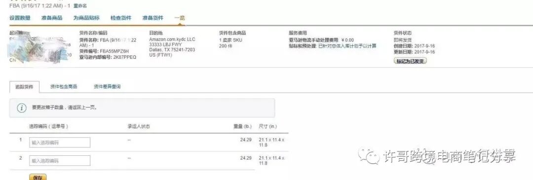 完成6个步骤:设置数量-准备商品-为商品贴标-检查货件-一览,然后把箱标准备好打印出来,帖在外箱上面,基本上没有什么问题了。我觉得亚马逊最最神奇的事情是,在准备火箭那一步,会弹出很多打包相关的产品Listing,包括胶布、拖车、纸盒等。