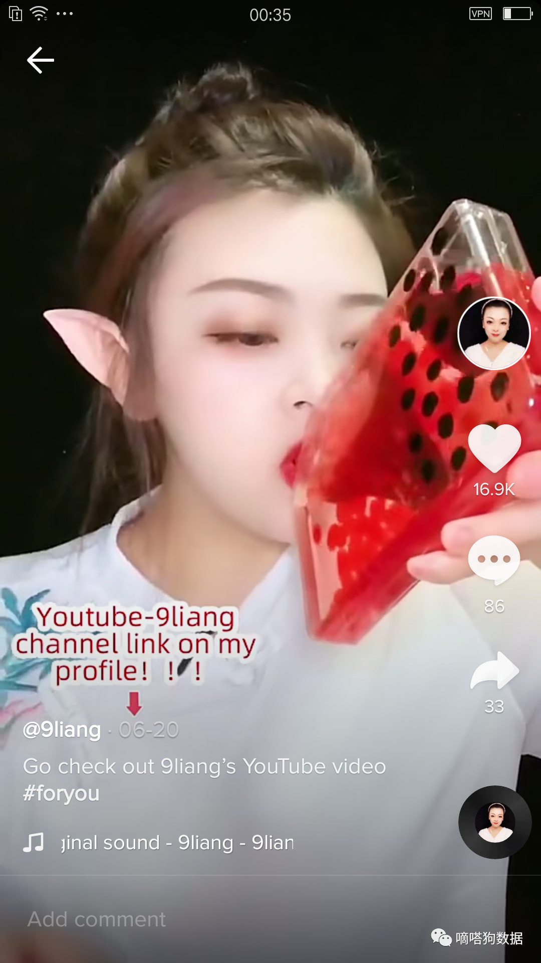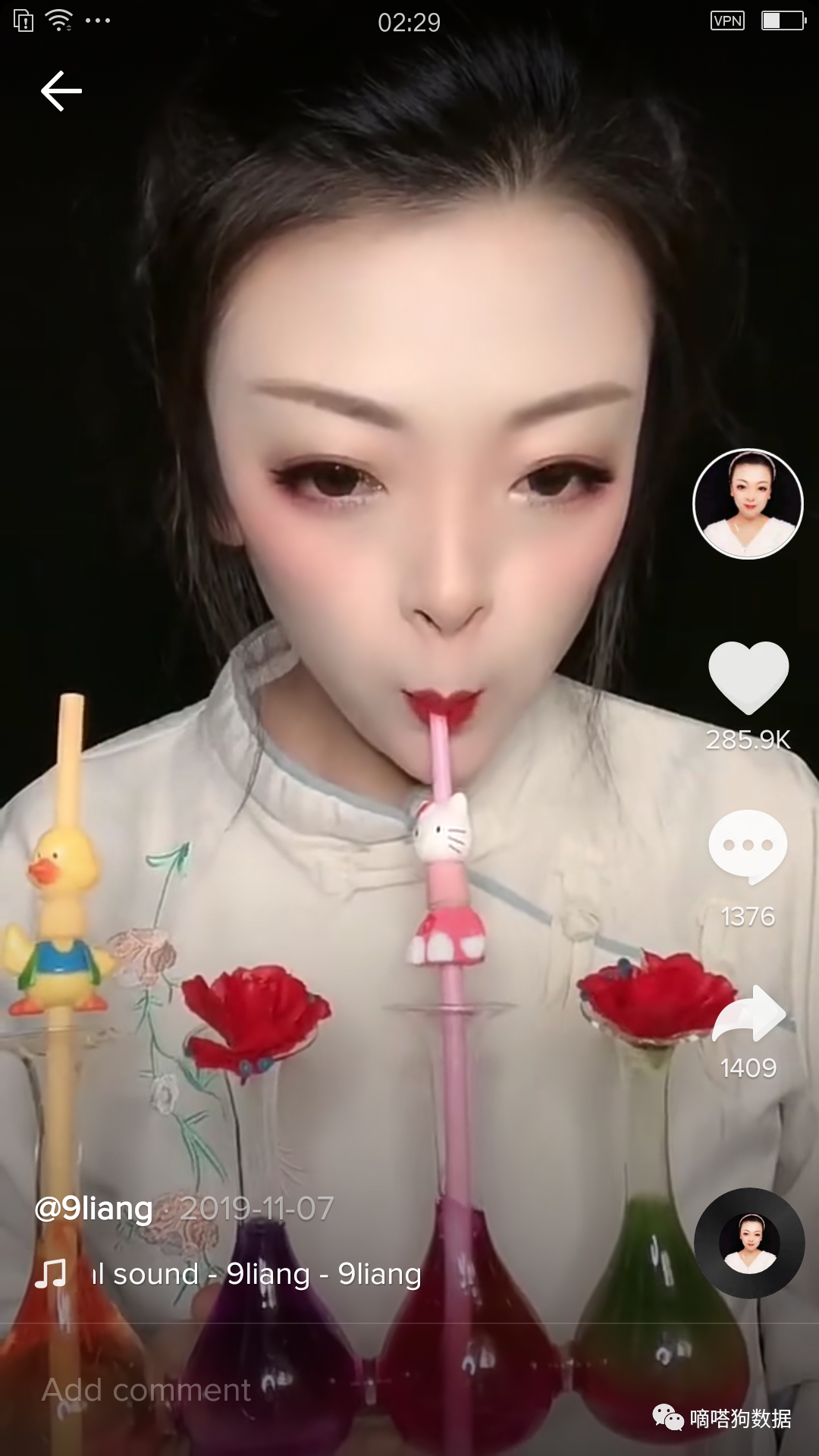 现阶段的抖音,各个领域都有头部大号。例如,创意领域的黑脸大V,剧情领域的陈翔六点半,美食领域的浪胃仙……创意领域需要有技术基础,剧情领域需要有团队支持。相比之下,美食领域的门槛似乎更低一点。 人以食为天,美食领域的火爆,根植于人的基本需求。只要是个人,就会对吃感兴趣。从点赞数,粉丝数的维度上看,美食领域一直都名列前茅。 所以大批的作者涌入美食领域,细化自己的内容,占领自己的一席之地。浪胃仙的定位是大胃王,翔翔大作战的定位是测评,徐大sao的定位是生活,野食小哥的定位是户外。 想在同质化严重的美食领域闯出一片天地,难度很高。同样是做吃播,抛开创作时间的早晚,你需要研究一下为什么别人可以火?有哪些方式自己可以借鉴的方式?是否可以另辟蹊径? 现如今,海外版抖音TikTok持续火爆,势必有越来越多的美食领域作者涌入。 在TikTok美食领域,我们通过嘀嗒狗数据跟踪发现了这么一个账号:9liang。9liang有240万粉丝,发布了130个视频,总播放量突破了6亿,在美食领域的粉丝量排在24位。 9liang的第一个视频发布于2019年11月7日,浏览量500万,点赞量28万5,评论量1376,数据十分可观。光看画面,9liang似乎和其他吃播没什么不同。单一颜色的背景,高颜值的美女,各种各样的食物,构成了画面的基本内容。文案都是Go check out 9liangs YouTube video,没有任何特色。 9liang的视频跟其他吃播最大的不同是,她没有添加背景音乐,用的都是原声。因为她吃的东西,喝的东西不一样,或者有不一样的容器,所以视频里的声音都是不一样的。令人奇怪的是,用户似乎很享受这类声音。 /02/ 那么问题来了,这到底是应用了什么原理?其实这类视频在Youtube里面有很多,都被分类到了MassageASMR 频道里。所谓的ASMR,百度里是这样解释的: ASMR(英语:Autonomoussensory meridian response,缩写ASMR),即自发性知觉经络反应,意思是指人体通过视、听、触、嗅等感知上的刺激,在颅内、头皮、背部或身体其他部位产生的令人愉悦的独特刺激感,又名耳音、颅内高潮等。 简单来说,ASMR 可以用一些由温和的触发器而引起的舒缓感受来描述。 举个例子,落叶被踩碎的声音使人愉快,这就是ASMR体验。再比如,按摩时头部感受到酥麻,这也是ASMR体验。前者的触发器是听觉,后者的触发器是触觉。 视频是ASMR当前的主要呈现方式。因为视频里包含视觉,听觉,有非常强烈的冲击感。虽然过程中没有触觉,味觉,嗅觉,但是大部分人表示通过视频观看他人表演和模拟以上动作,并同时听到做这些动作发出的声音,就足以触发 ASMR 反应。 所以我们可以看到的是,在9liang的视频里,吃什么东西并不重要,重要的是用户通过视频会触发ASMR 反应,有助于缓解压力,促进睡眠。同样是喝水,9liang利用了不一样的容器,发出了不一样的声音,给与了用户不一样的体验。 /03/ 美食领域的作者是否受到了启发?或许食物不是重点,声音才是重点,这也是一种另辟蹊径。Youtube里MassageASMR 频道的作者德叔的经典作品是敲击音表演,视频观看次数最多超过213万。另一个作者PPOMO,表演燃烧蜡烛的声音也收获了大量粉丝。 总而言之,我们需要的是在固定领域里发掘出新的方向。大胃王,测评,纪实都已经被玩烂了,你还想通过同样的方式把账号做起来,难度何其之高。而且,国外的饮食习惯限制了某些方向的发展,国内火爆的视频不一定能在TikTok再次成为爆款。例如中国菜的制作,不一定会引起外国人的关注。 多看嘀嗒狗数据多思考,做好独特的内容,你也可以成为百万粉丝的博主! 说在最后 嘀嗒狗专注于tiktok生态商业化研究,依托专业的大数据挖掘和分析,发现更具商业潜力的网红,跟踪最新的创意广告投放。 我们目前正在对各领域的网红进行数据跟踪和研究,解析不同博主爆红的独特方法。在过去的几个月中,我们参与了多个社群的tiktok大航海行动,结识很多百万粉丝的TikTok的创作者。 团队也运营了数百万的矩阵账号,我们总结了行之有效的TikTok的运营经验在嘀嗒狗指南中: 1、手机网络设置 2、TikTok安装注册指南 3、TikTok账号运营指导 添加我的微信:xiievil,获取嘀嗒狗独家的tiktok运营指南,我们欢迎所有想要乘着TikTok流量巨浪扬帆出海的小伙伴,一起研究,资源共享。 //END 来源: 作者 | 嘀嗒狗 图片 | TikTok