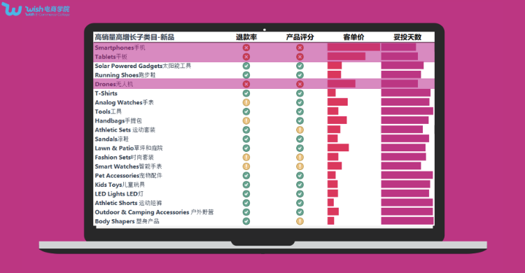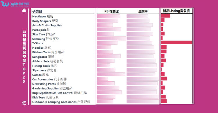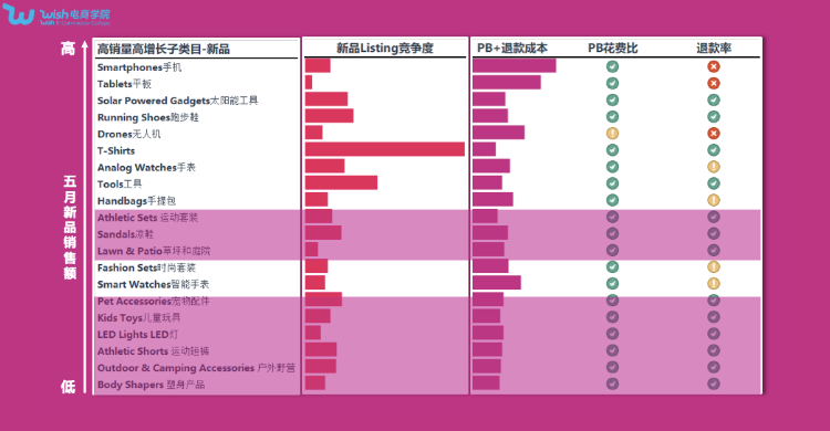 月初,我们发布了“高利润产品开发系列课程”的四月篇受到了众多商户的追加好评,可见有价值的选品数据仍是商户最期待的指导内容之一。 本期,我们奉上五月份的高利润新品与蓝海产品数据,供各位商户紧跟产品趋势,科学开发当下市场需要的好产品。 五月热销产品利润数据大揭秘! 把控平台成本,提升利润水平 我们从GMV前100名的子类目中,挑选了销售增长稳定且优于大盘表现的子类目名单,按照新品销售额和销售额增长率两个纬度进行筛选,优选出GMV排名前20的热销新品名单。 图1:五月热销新品子类目定位图 五月新品平均客单价>$10 五月新品销售额=30天内上传产品的GMV总和 我们对以上20个热销新品按照“销售额”大小排序,并加入“新品Listing竞争度”、“PB+退款成本”、“PB花费比”和“退款率”等影响利润的指标,以便商户更好地确定产品的可开发价值。 图2:五月热销新品子类目销售额排名 绿钩:数值低于平均标准 红叉:数值高于平均标准 黄叹号:稍高于平均标准 PB+退款率=PB花费比+退款率 PB花费比=PB花费/总销售额 退款率=退款金额/销售额 新品Listing竞争度: 出单新品的listing数量占该子类目listing数量之和的比例 新品listing竞争度、PB花费比和退款率等指标越低的子类目,意味着平台成本越小,利润水平越高,是理想的新品开发目标。 因此,图2所框选出来的平台成本相对较小的子类目都是值得商户开发的新品子类目。 图3:2020五月热销高利润新品子类目 如何正确使用图2表格? 观看视频,一个案例,教你手把手教你开发一款凉鞋产品。 点击“阅读原文”,看完整版视频! 优化退款率,关键看两项指标 图4:五月热销高利润新品子类目销售额排名 退款率=退款金额/销售额 产品评分:Rating 客单价:平均每个订单的售价 妥投天数:TTD,自订单释放到订单妥投的时间 退款率是影响产品利润水平的关键纬度,有效降低退款率有助于提升产品的利润水平。 “产品评分”、“客单价”和“妥投天数”被认为是影响退款率的三大指标。 由于高客单价产品通常由妥投时效有保障的物流渠道配送,妥投率较高。因此,“产品评分”与“客单价”才是影响退款率的强关联指标。 观看视频,一个真实手机案例,教你降低产品退款率。 点击“阅读原文”,看完整版视频! 五月高利润蓝海新品子类目大揭秘! 一次性,给你20个高利润蓝海产品子类目! 同样的产品池,当我们以“PB花费比+退款率”为标准从低到高进行筛选,即得出五月份高利润蓝海新品子类目Top20名单。 图5:五月高利润蓝海新品子类目排名 梳理上述20个子类目,我们将其总结为以下四个大类目: 图6:2020五月高利润蓝海新品子类目 如何正确使用图6表格? 观看视频,了解四大高利润蓝海子类目的详情开发技巧。 点击“阅读原文”,看完整版视频! 平均5%,高利润蓝海新品PB花费比! 图6:五月热销高利润蓝海子类目PB花费对比 通过对比上述子类目的PB花费比,我们不难发现,其30天内新品的PB花费比均在一个较低的范围内浮动,其中Necklaces类目的PB花费比数值最高,但也不超过20%。 得益于老品的自然流量,排名前20的高利润蓝海子类目的总体的PB花费比数值均小于5%。 由此可见,商户在运营上诉高利润新品时,若发现新品的PB花费比远高于图4所示的数值范围,则意味着相关的PB活动有较大的优化空间。