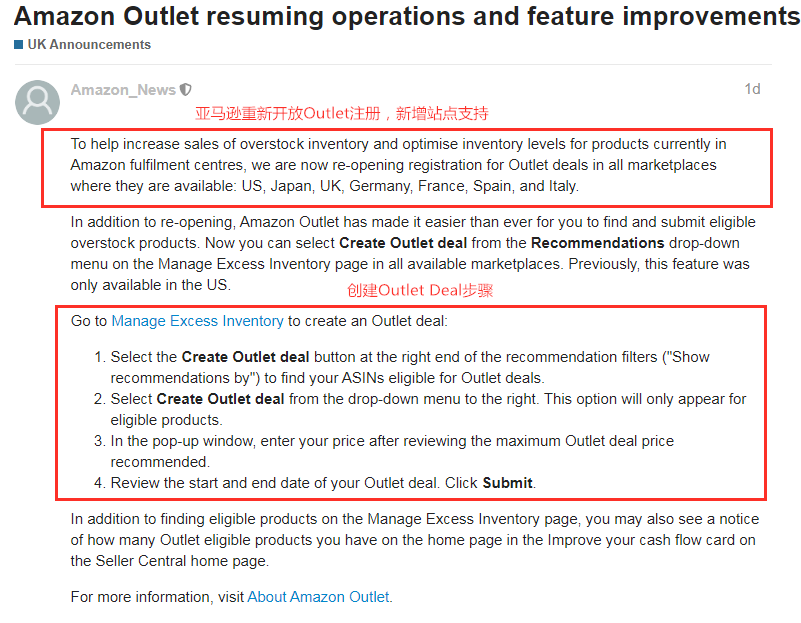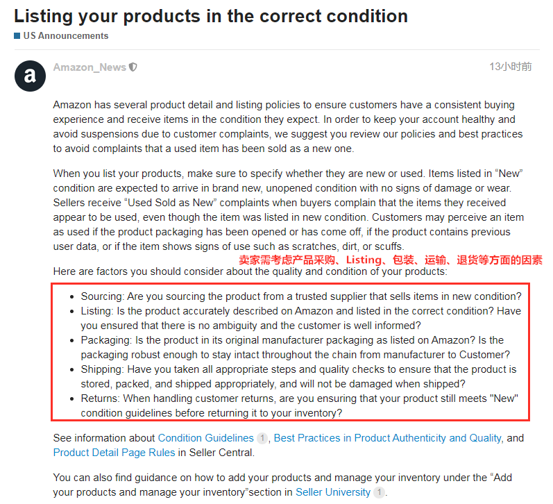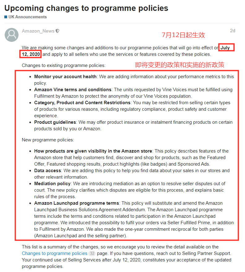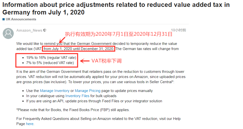 6月29日,亚马逊向卖家发出通知提醒,德国政府决定从2020年7月1日至2020年12月31日暂时降低VAT税率。 具体调整如下: 19%下调至16%(常规VAT税率) 7%下调至5%(减少的VAT税率) (图/亚马逊卖家论坛) 亚马逊表示,德国政府的目标是零售商通过降低价格将减价转嫁给消费者。由于上传的价格是毛价(含税),因此减免增值税不会自动应用于你在亚马逊上的价格。 你可以在Seller Central 中: 使用「管理库存」或「管理定价」页面手动更新价格 在你的目录中使用「库存文件」批量上传 如果你正在使用API,请通过Feed文件或「integrator解决方案」更新价格 在亚马逊上销售有关增值税减免的常见问题,你也可以访问以下页面获取帮助: https://sellercentral-europe.amazon.com/gp/help/G2JTM2AEPPKVKRQ3 二 7月12日起 一些政策变更和新政将落实 船长获悉,亚马逊于近日在欧洲站卖家论坛发布公告,正在对一些政策进行修改和补充,这些政策将于2020年7月12日生效,并适用于所有使用这些政策所涵盖的服务或功能的卖家。 (图/亚马逊卖家论坛) 对现有计划政策的修改↓ 监控你的帐户运行状况:亚马逊会将有关你的效果指标的信息添加到此政策中。 Amazon Vine条款和条件:Vine voice所要求的单位必须通过Amazon Fulfillment实现,以保护Vine voice用户的匿名性。 类别,产品和内容限制:出于各种原因,包括法规合规性,产品安全性和客户体验,你可能会被禁止销售某些类型的产品。 产品指南:亚马逊可能会在你或亚马逊出售的某些产品上提供产品保险或分期付款产品。 新计划政策↓ 如何在亚马逊平台上为产品提供可见性:此策略描述了亚马逊店铺的功能,可帮助客户查找、发现和购买产品,例如精选优惠,精选购物结果,产品亮点(如徽章)和站内广告。 数据访问:亚马逊正在添加此政策,以帮助你在亚马逊平台中找到有关你的销售的数据以及其他相关信息。 调解政策:亚马逊正在引入调解作为解决法庭外卖家纠纷的一种选择,新政策阐明了哪些纠纷适合该流程,并解释了该流程的基本规则。 Amazon Launchpad计划条款:此政策将替代和修订Amazon Launchpad业务解决方案协议附录。Amazon Launchpad计划条款包括与参与Amazon Launchpad计划有关的条款和条件。除了亚马逊FBA,亚马逊还介绍了通过SFP配送Prime订单的可能性,对双方(Amazon Launchpad和销售合作伙伴)作出了为期一年的承诺。 三 亚马逊提醒卖家:避免将退货作为新商品卖 6月24日,亚马逊发布通知要求卖家“以正确的条件上架Listing”。亚马逊表示, 为了保持卖家的账户健康,并避免因客户投诉而受到影响,建议你仔细阅读相关政策和最佳做法,以避免因将退货作为新商品出售而遭到投诉。 (图/亚马逊卖家论坛) 在上架产品时,一定要说明它们是新产品还是旧产品,处于“新”状态的产品应以全新的、未拆封的状态运抵,没有损坏或磨损的迹象。 尽管你提供的是全新的产品,但也可能会收到投诉是“二手货冒充新货”,即买家抱怨他们收到的产品似乎是用过的。如果产品包装已被打开或脱落,产品包含先前的用户数据或显示出使用痕迹(例如刮擦,脏污或擦伤),则买家可能会认为该产品不是全新的。 你应考虑以下几项有关产品质量和状况的因素↓ 采购:你是从可信赖的供应商那里采购产品吗? Listing:产品是否在亚马逊上正确描述并以正确的状态列出?是否确保没有歧义,并且客户已充分了解情况? 包装:产品是否采用亚马逊所列的原始制造商包装?包装是否足够坚固,可以在从制造商到客户的整个链中保持完整? 运输:你是否已采取所有适当的步骤和质量检查以确保正确存储、包装和运输产品,并且在运输时不会损坏产品? 退货:在处理客户退货时,你是否确保在将产品退回库存之前仍满足“新”条件准则? 对此,有卖家提出质疑。关于“退货”方面,卖家表示这应该是亚马逊物流在处理退货时需要考虑的一个因素。并且,亚马逊应该考虑允许卖家将所有亚马逊物流退货自动标记为不可售,仅此一项就可以大大减少新旧二手产品的投诉。 (图/亚马逊卖家论坛) 船长认为,不管亚马逊怎么调整,以上这些因素都需要考虑进去,但有时候遇到一些比较较劲的买家,如何做好售后邮件沟通很重要。 四 亚马逊取消了发货数量限制 6月24日消息,亚马逊发布公告表示,已经取消了卖家可以发送到亚马逊运营中心的产品的数量限制,并且还将继续提高客户承诺和产品的交付速度。 (图/亚马逊卖家论坛) 此外,亚马逊还在公告中指出,为帮助卖家将产品从中国直接运送到在美国的运营中心,其增加了新的和更频繁的航班选项,以供卖家通过全球运输服务选择。 需要注意的是,部分站点仍暂时限制接收重量超过15千克的产品,当你为产品创建新的货件时,货件创建工具会建议你是否有可以处理它的运营中心。 根据亚马逊建议,你需要: 检查“ 补充库存”页面 https://sellercentral.amazon.com/restockinventory/recommendations (复制到常用的浏览器打开) 检查 “ 库存报告”页面 https://sellercentral.amazon.com/gp/ssof/reports/search.html?recordType=RestockReport (复制到常用的浏览器打开) 以查看产品的最新建议补货数量和日期,亚马逊通过考虑需求预测和你提供的产品级别信息,有助于最大程度地减少缺货或低库存情况,以恢复库存水平。 五 亚马逊成立全球打假团队 阻止假货上架 据悉,亚马逊于近日成立了其全球打假团队,成员包括前联邦检察官、经验丰富