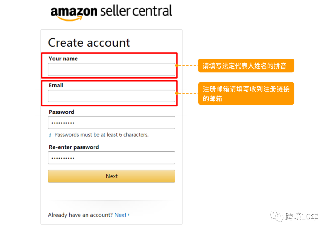 分别输入法人姓和名,注册邮箱和密码,点next。注册不同站点要用不同的邮箱地址;