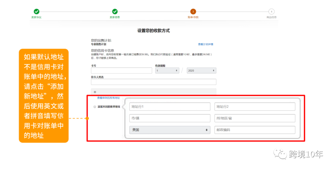 付款方式就是之前准备的信用卡,填写卡号,有效期,持卡人姓名和账单地址,账单地址如果不同可以添加新的地址;这个信用卡持卡人可以不是法人,但是建议最好是法人,亚马逊会在您账户中没有余额的情况下扣除月租费美亚$39.99,,欧亚£25,日亚¥4900以及销售费用等等;