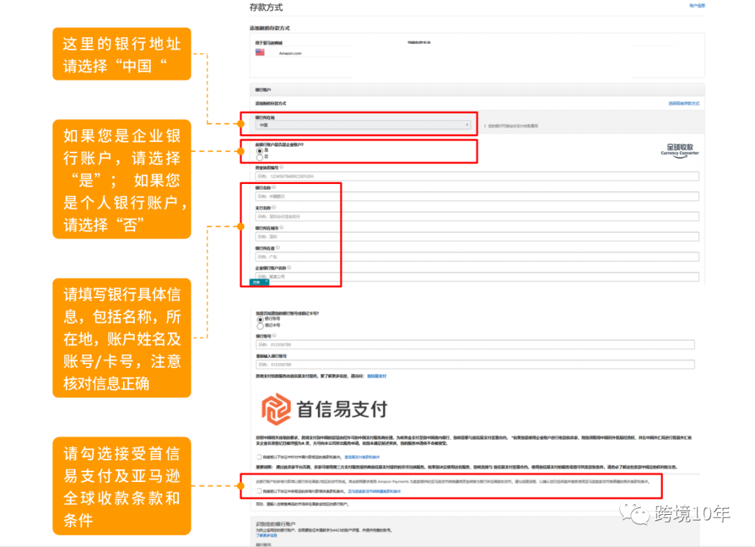 方法三:亚马逊全球收款。可以使用人民币接收全球付款并直接存入您的国内银行,选择银行地址为中国,按照提示信息填写银行账号或借记卡号信息,勾选接受首信易支付及亚马逊全球收款条款和条件(相对来说佣金会高一点,但是方便)