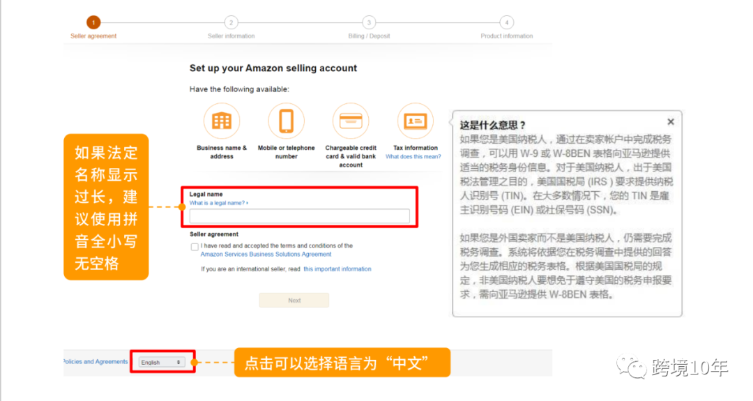 在legel name处用拼音填写公司的法定名称(营业执照上的拼音),勾选卖家协议,点next。