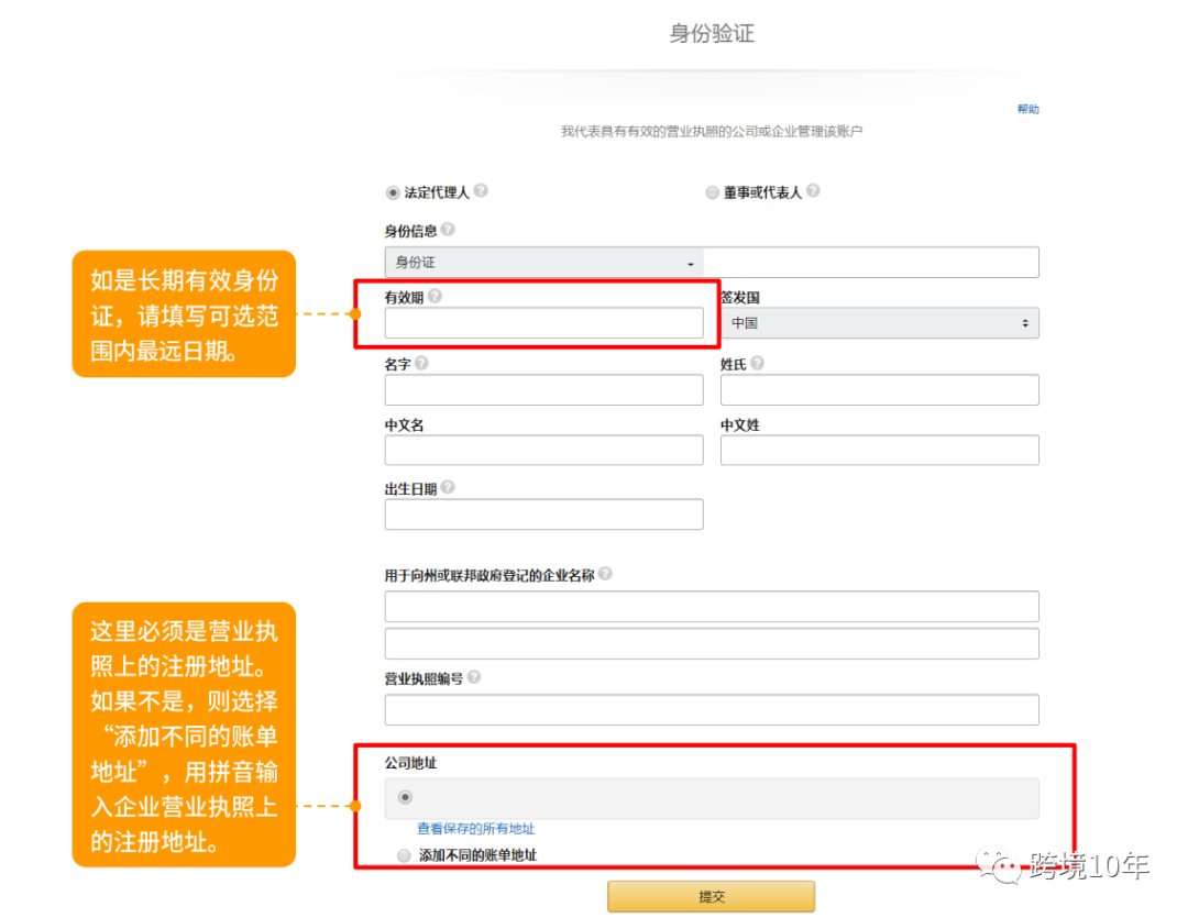 这里的公司地址是默认前面填写的办公地址,如果办公地址不是企业营业执照上的注册地址,需要点击添加不同账单地址,用拼音输入。(建议最好地址是从头到尾一致,省去麻烦)