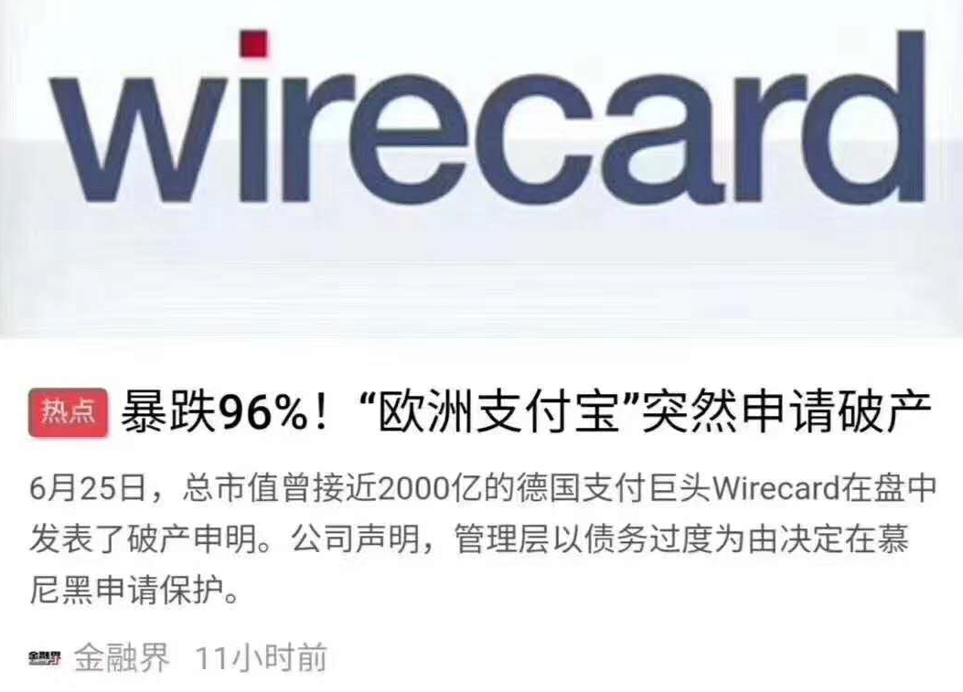 有着“欧洲支付宝”之称的德国支付服务提供商Wirecard公司被审计方爆出财务丑闻,仅仅一周后,Wirecard向法院申请破产,此时公司的股价与一周前相比已跌去了近97%。