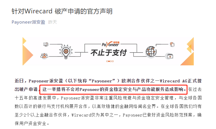 对此,P卡也第一时间进行了声明。在声明的开头,P卡直接表示:Wirecard 的破产申请将不会对Payoneer的资金稳定安全与产品功能服务造成影响。