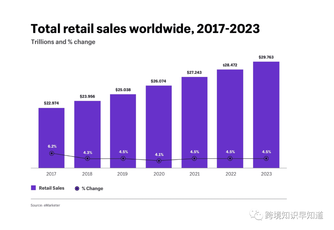 全球零售市场在2019年突破25万亿美元。然而,与前五年相比,增速已大大放缓,并且预计到2023年不会回升。