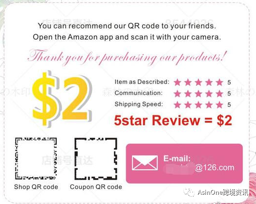 正确的做法:可以放折扣码,可以在售后卡上写一些有趣或者有用的内容,根据你做产品来,比如食谱,美妆教程之类的,图片做得精美一点。千万记得内容要中立,不要诱导客户,可以是要客户的反馈和建议,不要直接索要五星好评,前者合规,后者则相反。