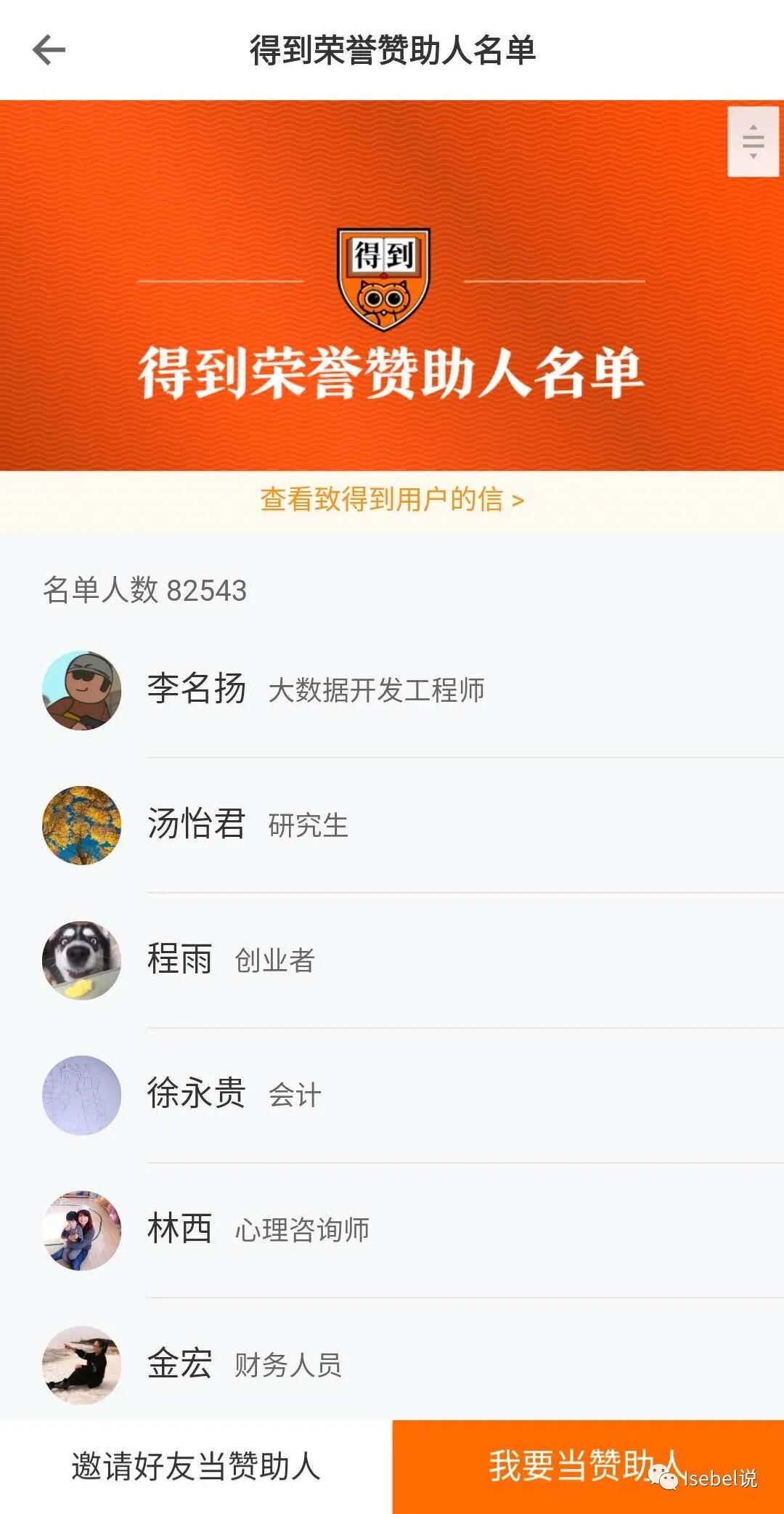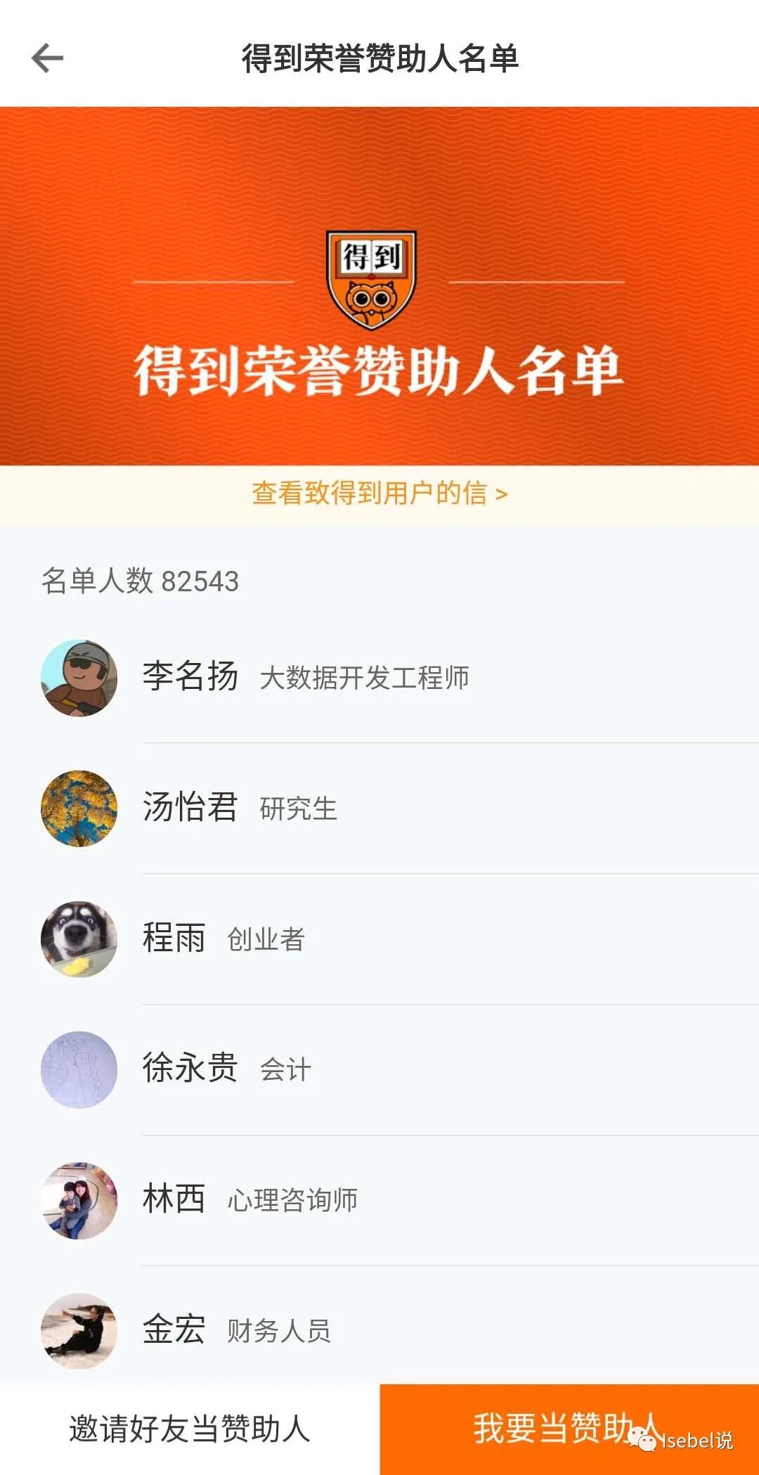 推荐得到给好友活动: 进入得到赞助人名单页; 点击“我要当赞助人”,进入得到致用户的第二封信; 或点击“邀请好友当赞助人”可转发已开启分享的app 。 在该页面下留言真实姓名和真实身份。