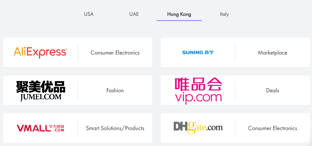 香港:天猫、苏宁易购、速卖通、上海家化、聚美优品、SheIn、唯品会、华为商城