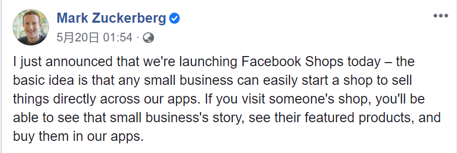 2020年5月20日,Facebook总裁扎克伯格在个人主页发布了一条激动人心的动态长文,宣布推出Facebook shop功能,希望以此帮助美国的小企业将其社交媒体资料转变为数字店面,允许企业所有者免费在Facebook和Instagram上建立在线商店。