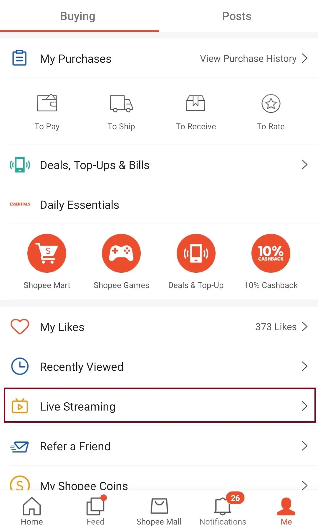 -在shopee手机app的我的页面,点击live streaming,进入如下页面。