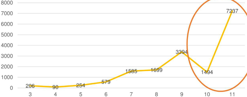 shopee某美妆店铺,直播了5个月之后,该店粉丝迎来爆发时增长,期间粉丝一直稳定增长,最高一月新增约7200个粉丝。