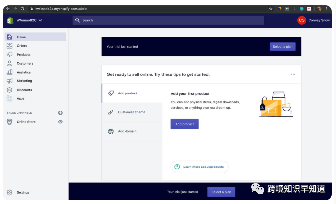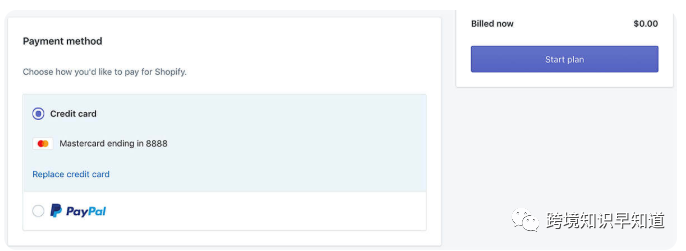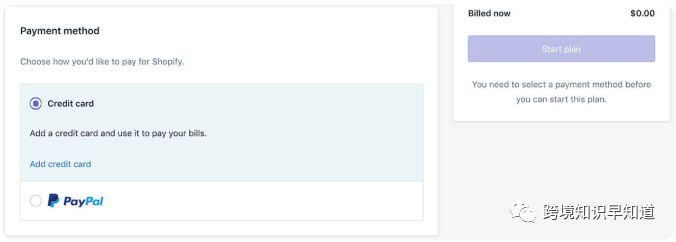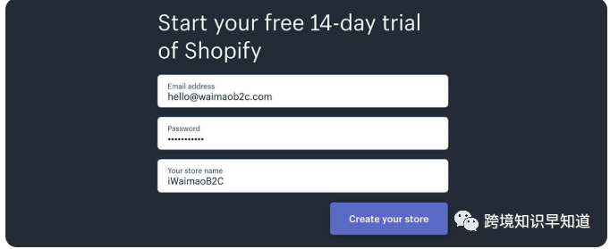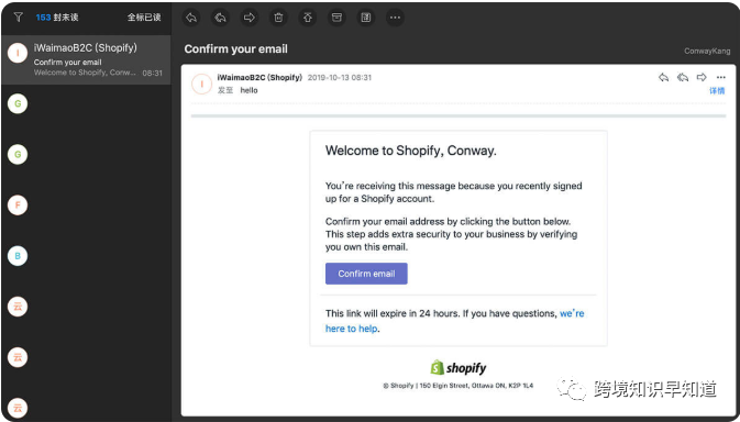 之后就是在2周的免费使用时间里学会Shopify的功能结构、绑定域名、上传产品和推广。输入邮箱(选择国际通用邮箱Gmail、Outlook等)、密码和商店名称,Shopify会根据提交店名生成一个Free的二级域名,用于后台登陆操作,同时也会将Store Name作为临时的Website logo显示在网站前台,点击“Create Your Store”,开始分三步创建你的Shopify账户,这里提交的信息如实填写即可,提交虚假地址小心被封,填写完毕,Enter your store,就进入独属于你的Shopify后台了,之后,你会在你的注册邮箱里收到一封Shopify发送的验证邮件,如下图:提交信用卡信息或PayPal信息,用于缴纳Shopify的月租费用,Shopify绑定付款信用卡/PayPal账户缴纳月租,这里强烈建议账户注册成功后立刻提交信用卡信息或者绑定PayPal账户来缴月供,Warning: 很大一部分人的Shopify账户就是在绑定信用卡到Shopify的时候被封掉的——在无意识使用梯子工具的时候。