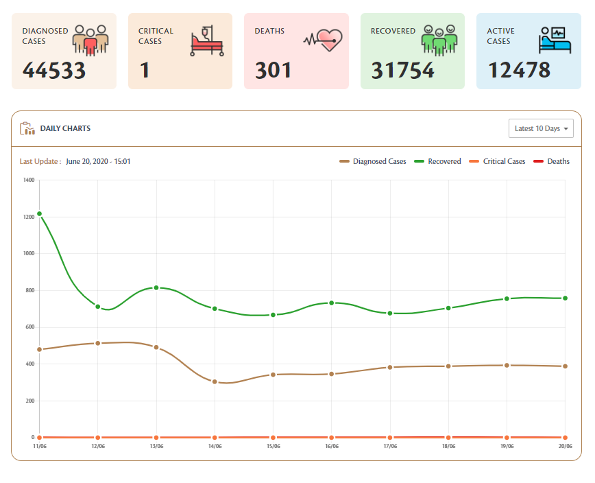 阿联酋卫生与预防部周六报告了388例病例,使该国确诊病例总数达到44,433例。也有新的1例死亡案例。