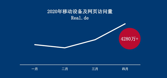 real.de作为德国最具潜力的电商平台,在年平均增长率12%的德国电商行业中,平台增长率高达75%。2020年4月,平台较去年同比增长更是超过300%。作为德国第三大电商平台,月均访客量超过2100万,自今年四月以后,平均客访量更是翻倍增长超过了4200万!