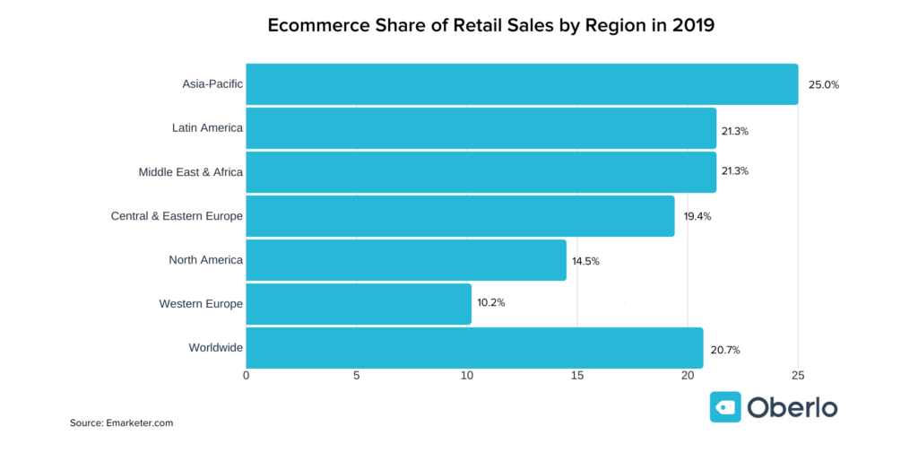 不可否认的是,近年来拉丁美洲的电子商务正在飞速增长。2019年,该地区线上销售增长率为21.3%,高于20.7%的全球平均水平,除开众所周知的亚太地区,拉美2019电商增速排在了世界六大区域的第二名。这个数字的背后是拉丁美洲4.3亿互联网用户,超1.6亿的线上买家,以及整个地区64%的社交媒体平均渗透率。