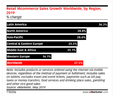 (智能手机的爆发直接导致了拉丁美洲移动端电商销售额的飞速增长,在2019年,拉丁美洲的移动端电商销售额增长率排在6大地区的第一名,增长率为36.3%,比排在第二名的北美高了接近8个百分点。)