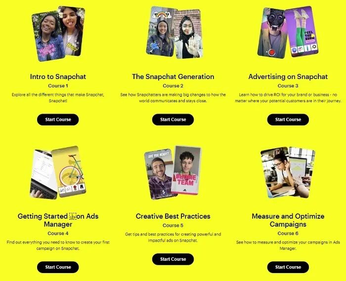 Snapchat官方表示,Snap Focus的课程有六门,可以让人们对Snapchat平台本身、平台广告形式和商机、如何系统部署广告战略和创意活动,以及广告创意实践有一个基本的了解。
