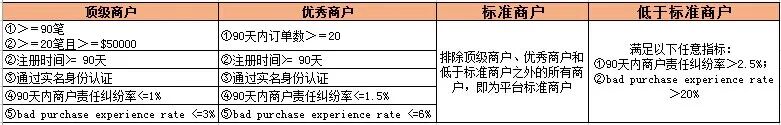 商户首次被评为低于标准商户,其订单将被延迟放款120天,且不可购买广告;第3次被评为低于标准商户,其产品的搜索排名将靠后;第6次被评为低于标准商户,敦煌网将关闭其账户。