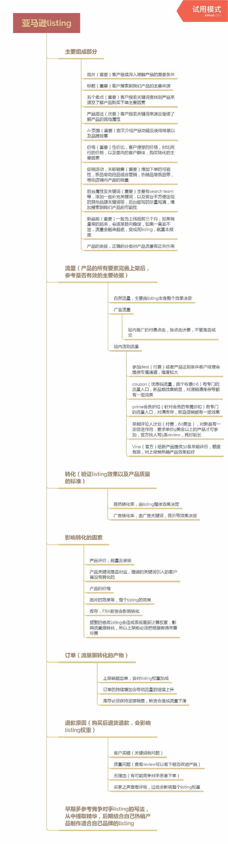 调研工作: 一、 了解自己的产品 二、 了解竞争对手产品,具体如下: 1、先看完类目前20名的页面,了解他们的卖点,他们的图片风格,他们好的表达 2、看完前20名的QA,了解客户关心的点 3、看完前20名的差评,了解他们的痛点 三、比较,请思考: 1、我们的产品,和竞争对手比较,有什么优点,要在哪里展示 2、客户比较关心的点,有没有哪些是竞争对手页面没有写到的,但是QA很多的,我们的产品有这些点吗?要写在哪里? 3、竞争对手的痛点,我们有没有,如何改进?能否通过操作说明来规避?如果能,写在说明书?写在A加或描述?能否和供应商协商改善这些痛点 准备Listing工作: 1、图片:请看完英国德国美国京东淘宝天猫卖得好的卖家的图片,一边看一边思考,有哪些创意可以借鉴,有哪些结构可以借鉴?哇,这张图很好,我要借鉴,我要做得比它好!注意:是借鉴!!!!!!!不是原图拿来直接用!!!!! 2、标题:请看完相对应站点前20名的标题,找出他们最常用的关键词。 请去亚马逊搜素框找出所有的大词和长尾词 请用关键词工具找出关键词List 然后,请结合这三个途径得来的关键词,挑出相关性最高,搜索量最高,客户最常用的词放在你的标题里。注意不要堆砌,要结合你的卖点,一定要结合卖点! 至于五点描述之类的,差不多类似套路。 后期再根据广告和转化率慢慢调整。