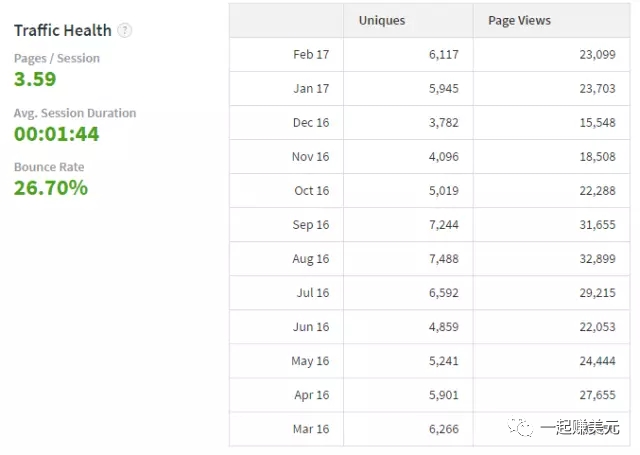 这个是强制要求提供的,Flippa会要求卖家同意授权从谷歌分析调取待售站点的流量数据,由于数据来自谷歌的日常跟踪,基本是网站的真实访问数据。一般包含平均页面浏览量,页面停留时间,跳出率。通过下面两个图表呈现: