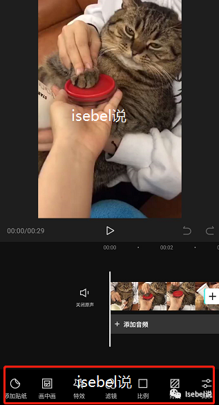 其他功能有“背景、添加贴纸、特效、画中画、背景、调节”等功能。