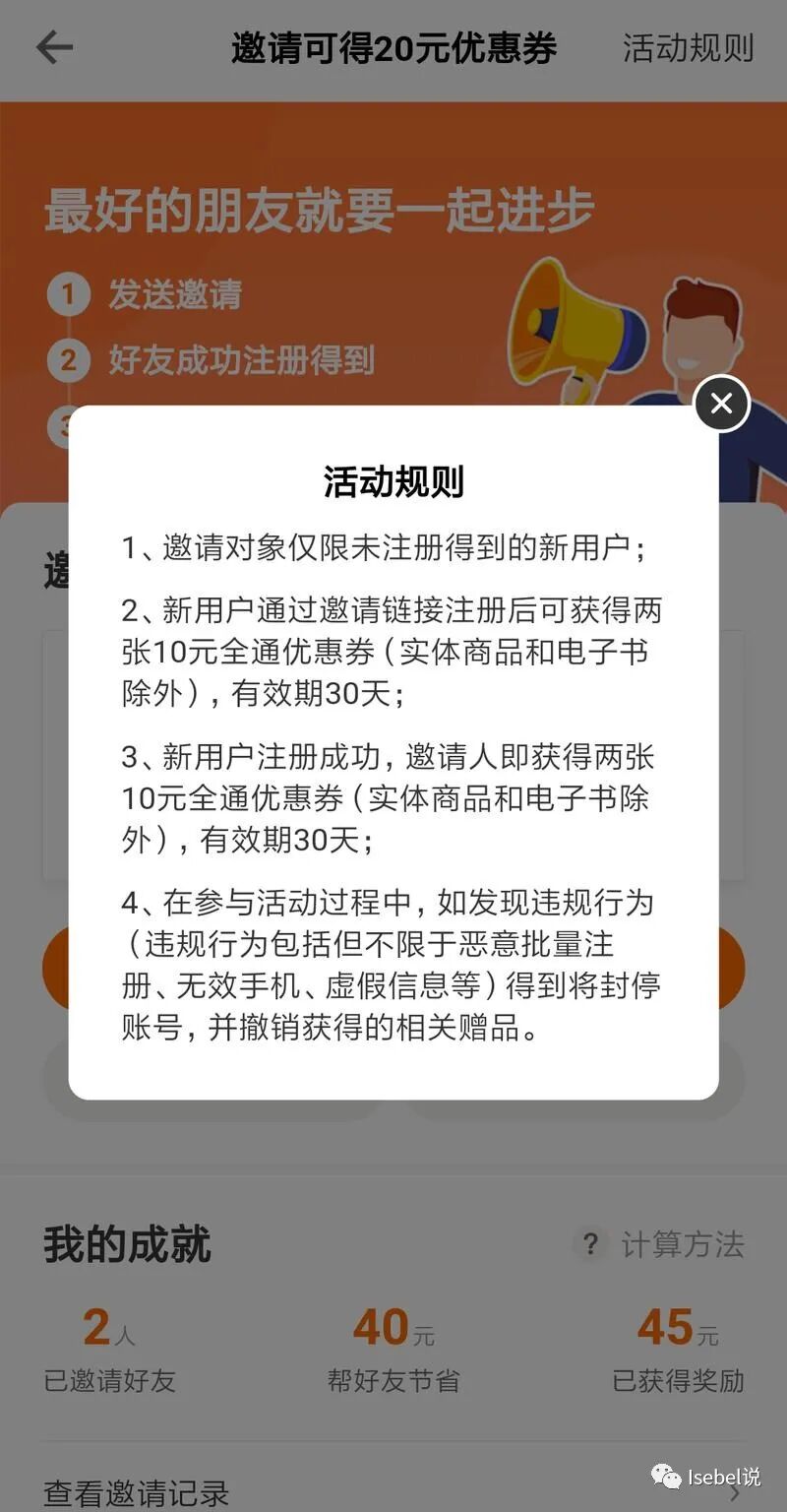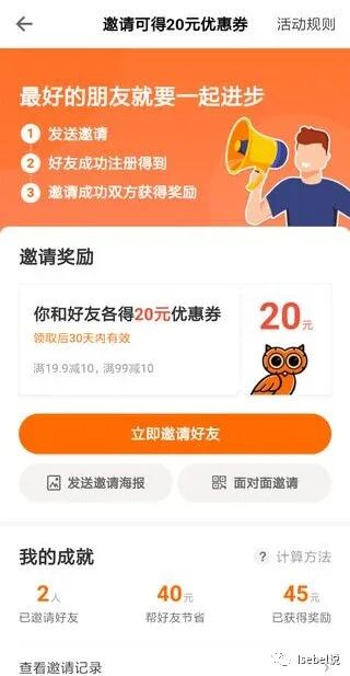 邀请活动加上分销形式,通过分享好友,好友注册得20 ,自己可以返20元。活动既使用了病毒营销,推荐给好友,好友省钱,自己也可以获得优惠的物质利益;同时,页面介绍语是让好友一起学习学习得到知识,帮助用户塑造人设,得到精神上的满足,与好友一起学习,增加了用户分享的动机。这种模式就是A邀请B成功注册,A获得X好处,B获得Y好处。是2019年比较流行的病毒营销方式之一,且经久不衰,多用于社群裂变中。通过利益刺激用户拓展强关系的机制,这里的关键点,就是好处。虽然这个案例比较过时,目前这种邀请返现的机制已经用烂了,但是基于优质产品的高价分销还是能打动用户。其中底层的逻辑是一致的。设计新的邀请机制是可以学习其中不同用户群的激励手段。用户会愿意邀请自己的朋友一起打卡互相监督,在互相学习中得到精神满足。从另一方面,这种满足是用户认为学习是自豪的事情,需要让更多的人知道,可以通过课程的文案,帮助用户塑造人设,增强转发动机。关键点在于,需要设计好一套成本可控的利益机制,算清楚单个获客成本,及每个用户的终身价值,注重文案对不同用户的适配性。这种邀请方式需要注意风控,如果有多个手机互相操作,还能叠加使用券,很容易被撸羊毛。这里有一个点是课程类产品只要做一次产品,可以重复买很多次,所以风险会比较低,但是也需要考虑过度的发出券让课程贬值,a.所获得的优惠券,只限单个课程的购买,部分品类券不可同时叠加使用,完成了一定的学习时长可以送低价券,用户学习时“组队PK”成功可以获得送券。