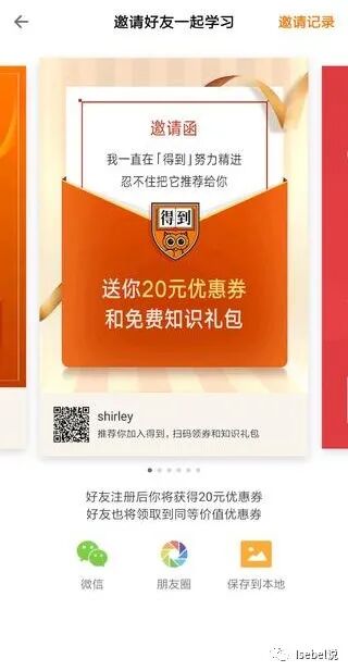得到邀请活动,主要在“得到”APP中,通过推荐“得到”给好友,邀请成功,可以获得奖励。