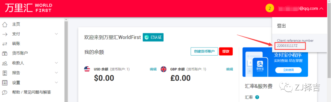 WF客户参考号在登入万里汇账户后右上角用户名旁边的小箭头下拉,如下