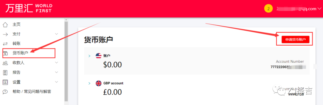 lazada打款到万里汇的账户是美元,手动发起提现时,WF再把美元按中行现汇买入价换成人民币到银行卡。即美元银行账户连接万里汇和Lazada,注册成功后即可在万里汇后台创建美元货币账户,操作如下