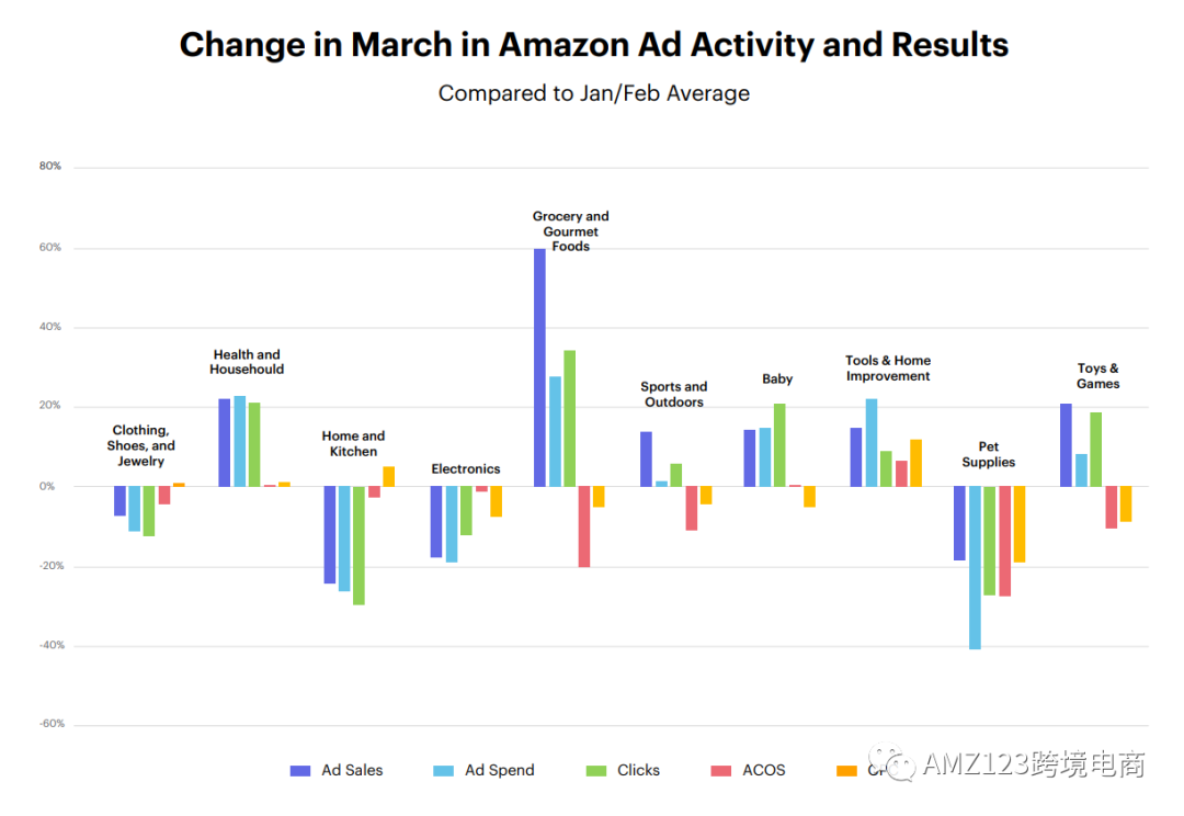 从下图可以看到,3月杂货&美食(Grocery & Gourmet)的广告销售额涨幅最大,比1、2月平均水平增长了60%,点击率也增长了34%,因此ACOS下降了20%。