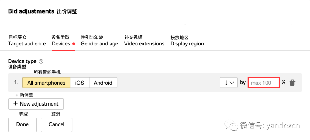 通过出价调整功能您可以为不同类型的设备设置广告系列。为了可以只在移动端设备上展示广告,需要将电脑端广告系列的出价降低100%,相反,为只有在电脑端设备上展示广告需要在移动端广告系列设置 - 100%的出价调整。之前,展示广告系列中有这种功能,今年初,我们添加了根据操作系统进行出价调整,而现在所有的广告系列都有了这种功能,以便您可以精准购买流量。