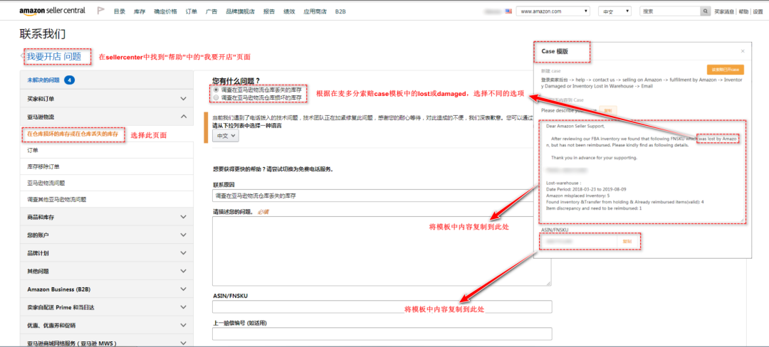 卖家骑士FBA索赔功能准备了对应的索赔模板,你可以直接点击对应的SKU模板,在seller central中按照索赔路径找到开case的页面,将模板内容直接复制在case中,向亚马逊索赔。