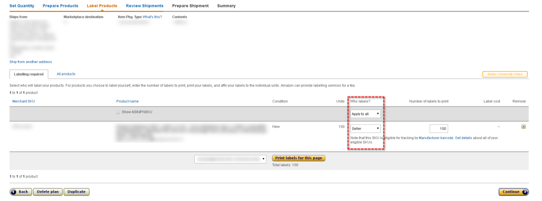 在“who labels” 下面选择“Amazon”,表示让亚马逊贴标。