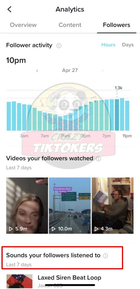 在TikTok的流量分析中(Analytics), 有另外一个了路劲了解自己粉丝最常听的音乐,如果你在发视频的时候多配一些粉丝喜欢的音乐,这样会增加粉丝对你这个“IP”的粘度,往往粉丝都会因为喜欢某个音乐而关注发视频的人,这样可以提升评论率和点赞率。