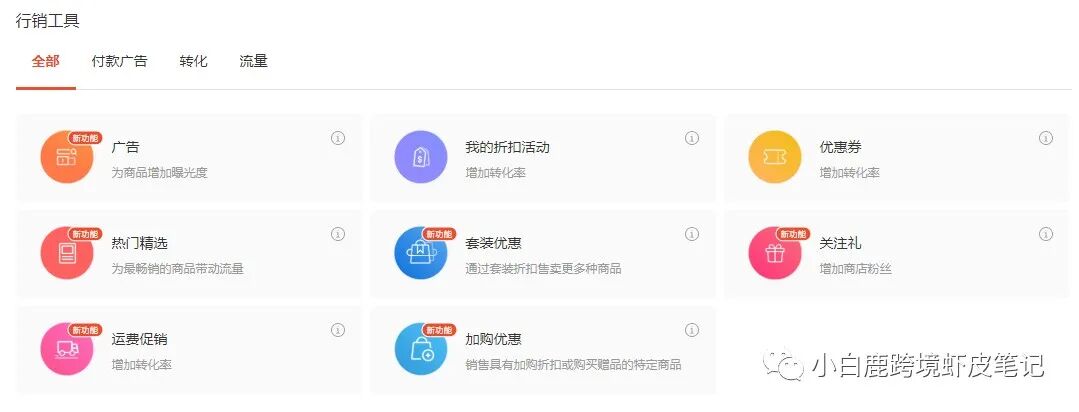 一般上架产品的时候都是一口价,在产品上架成功后记得要去店铺后台打一下折扣,这个折扣不要打的太高或者太低。同时店铺内的各种行销工具用起来