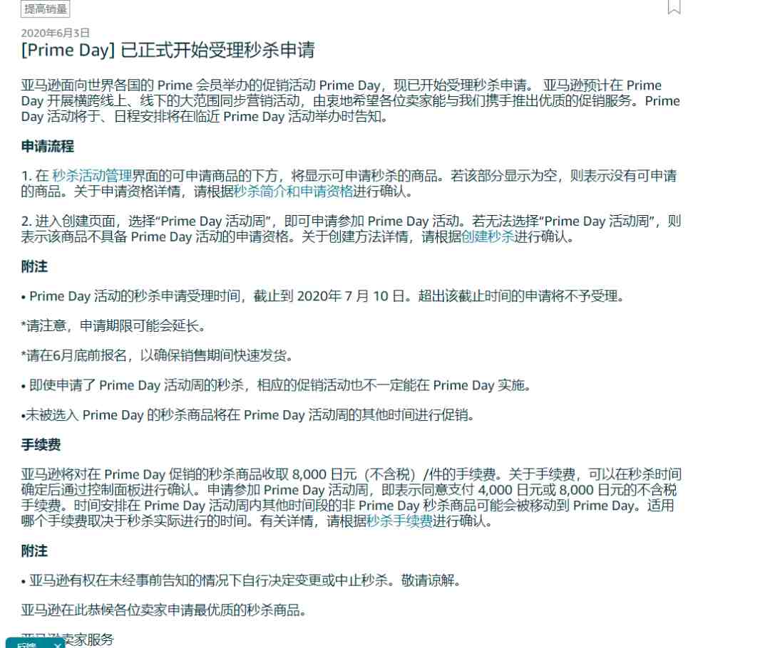好消息是这两天已经陆续有日本站卖家收到Primeday促销的提报通知,从附注中可以看到日本站秒杀申请截止到7月10日。