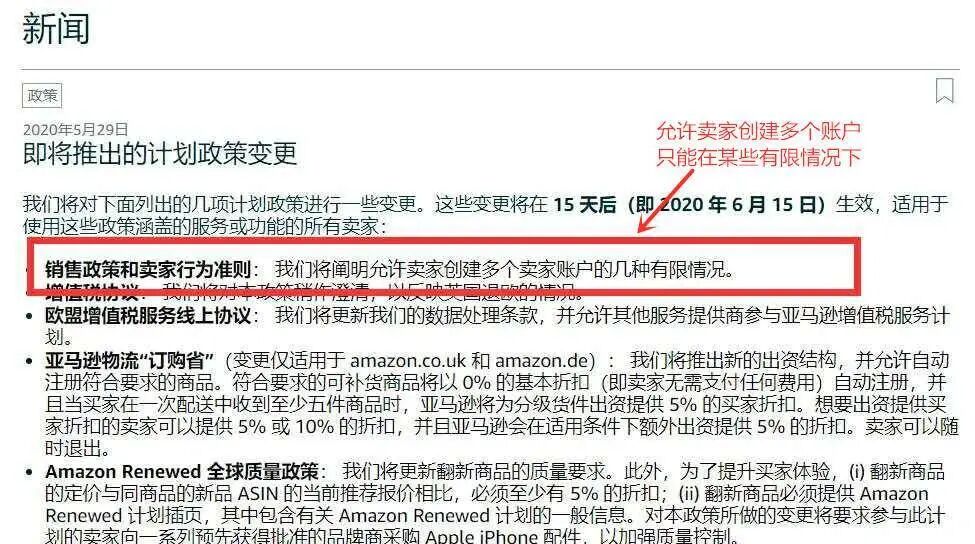 上周,船长和卖家们分享了有关二审的一些注意事项和小技巧;这周,我们将围绕账号关联问题继续为大家解疑答惑,希望能够帮助卖家们在运营过程中规避账号关联问题的发生。 在讲解账号关联问题前,船长先插播一则「劲爆」消息。最近,很多卖家群、自媒体和大号在传亚马逊同一站点将允许卖家创建多个销售账户。 据悉,这可能和近期亚马逊欧洲站后台发布的关于「即将推出的计划政策变更」通知有关。在第一条「销售政策和卖家行为准则」中有提到,亚马逊将会明确允许卖家创建多个卖家账户的几种有限情况。 (图源亚马逊欧洲站后台) 有业内人士表示,该政策变更之后,亚马逊或允许在符合有限情况内的卖家创建多个账户。还有卖家联系招商经理和客服称,经过确认,有业务需求的卖家可以申请多家店铺,并且,可用同一家公司信息进行注册。 (图源卖家咨询客服的回复截图) ? 争议 1 是否同一站点允许卖家创建多个账户? 有经验的卖家应该都知道,亚马逊明文规定同一站点只允许卖家运营一个销售账户,除非卖家已获得亚马逊的许可且有开设多个账户的合法业务需求。 (图源亚马逊销售政策部分内容截图) 合理的商业理由包括: